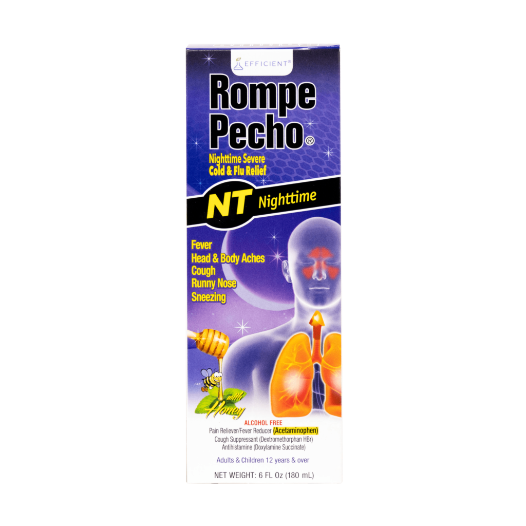 Experience relief with Rompe Pecho® NT, your ally in controlling cough and flu. Our cough syrup is formulated to calm coughs, reduce fever and relieve those annoying body aches.
